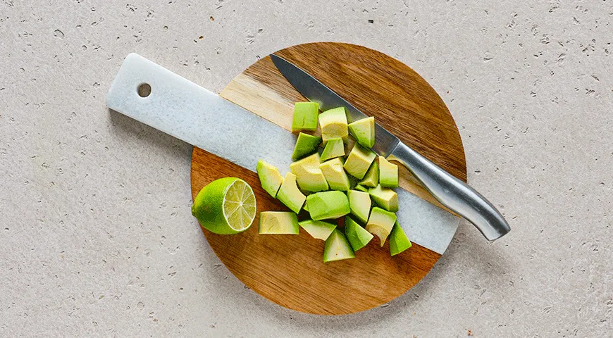 Авокадо разрежьте пополам, удалите косточку и нарежьте кубиками со стороной 1 см. Смешайте кубики с соком половины лайма, чтобы предотвратить потемнение.
